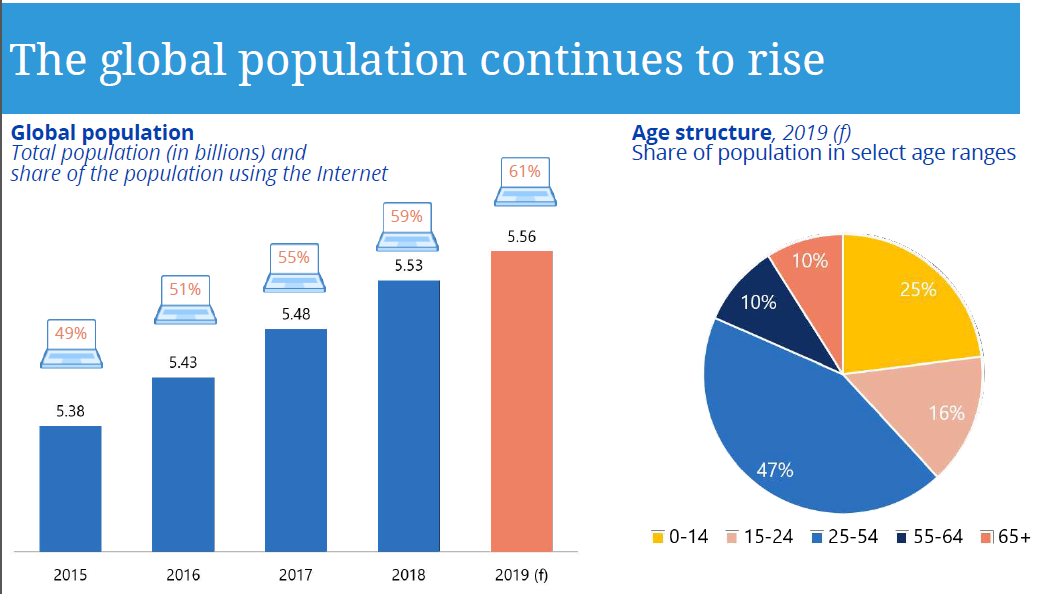Как отмечают исследователи, численность населения Земли неуклонно увеличивается. В частности, согласно прогнозам, к концу 2019 года в 44-х странах, охваченных отчетом, будет около 5,56 млрд человек, что на 30 млн больше, чем годом ранее. Почти половина этого населения (47%) – экономически активные люди в возрасте 25-54 лет.