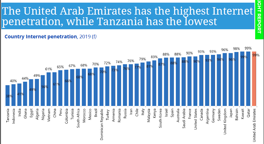 Самый низкий уровень проникновения интернета в Танзании, где всего 38% населения имеет доступ к международной информационной сети. Где-то посредине находятся такие крупные страны как Китай (61%) и Россия (76%).