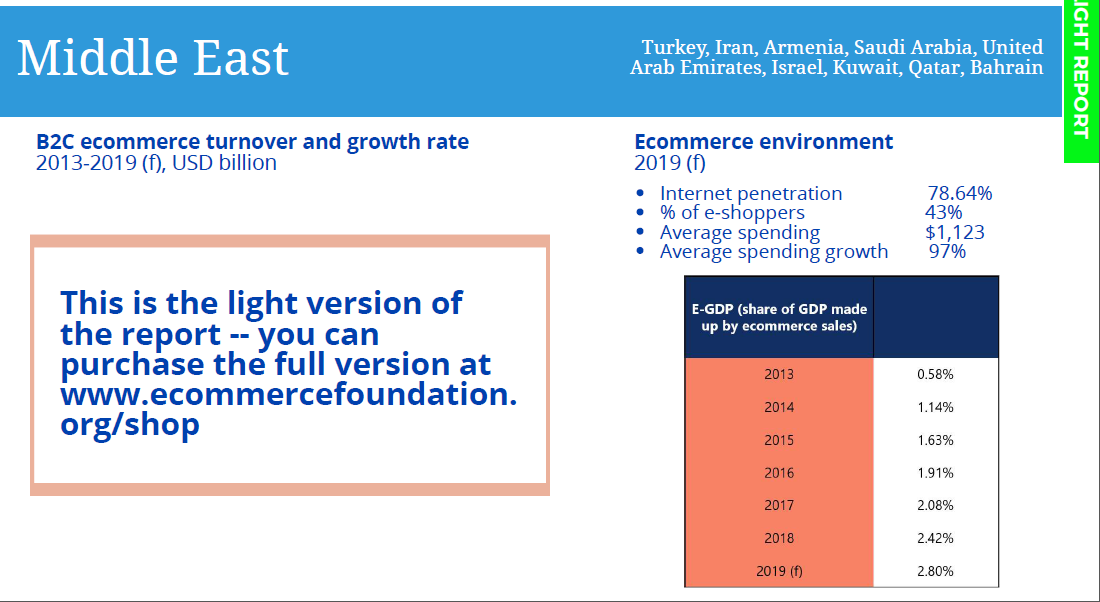 Многие правительства Ближнего Востока активно инвестируют в инфраструктуру и цифровые услуги, чтобы стимулировать рост международной электронной торговли. Однако несмотря на высокий уровень проникновения интернета в регионе, местные ритейлеры не удовлетворяют спрос и тем самым вынуждают онлайн-покупателей покупать трансграничные товары. Например, в ОАЭ таких 60% покупателей, а в Катаре – 67%. Традиционно покупки совершались в Китае, но все чаще товары заказывают из США и Германии.