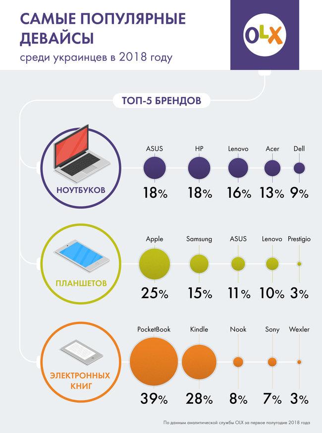 Техника стала самым популярным товаром, который покупают в интернете. По информации OLX, в первом полугодии 2018-го среди планшетов чаще всего покупали iPad. А среди ноутбуков украинцы выбирали ASUS и HP.