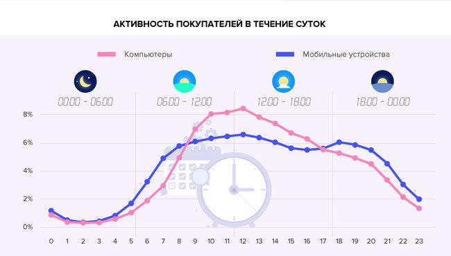 Пик покупательской активности приходится на 12 часов дня. В обед пользователи совершают около 9% покупок. Вообще активнее всего люди покупают в первой половине дня – с 10 до 13. С компьютеров чаще всего покупают в пятницу, а со смартфонов – в среду и воскресенье.