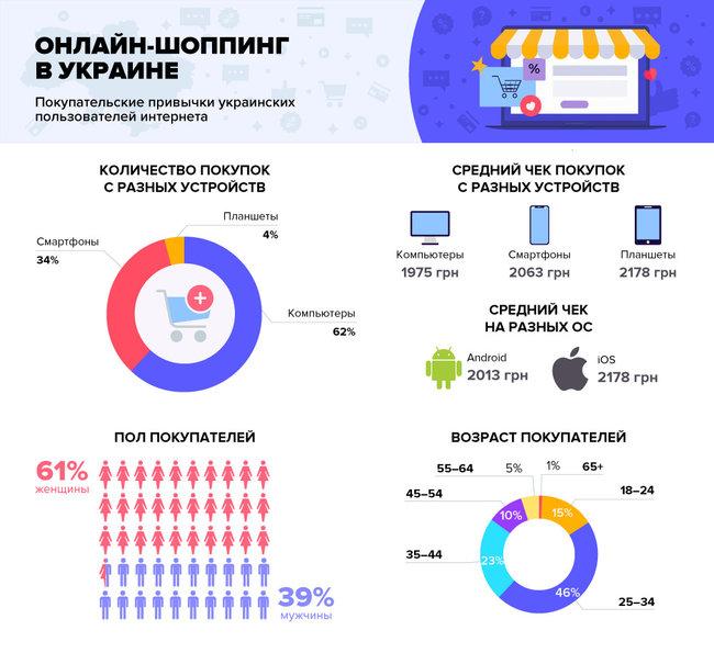 По данным GfK интернетом в Украине пользуется 20 млн человек. Женщины покупают чаще. В прошлом году они совершили 61% покупок, мужчины – 39%. Среднестатистическому украинскому онлайн-покупателю от 25 до 35 лет. На эту возрастную категорию приходится около 46% онлайн-продаж.
