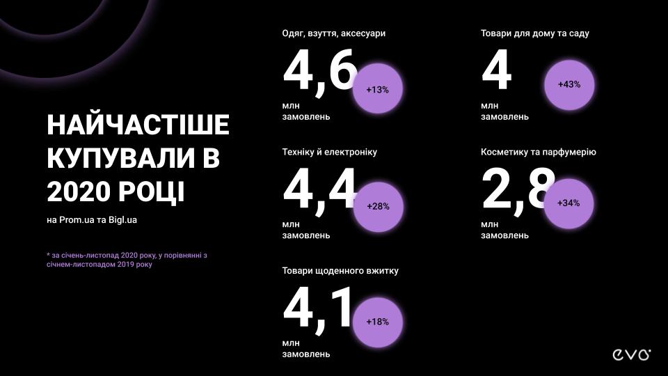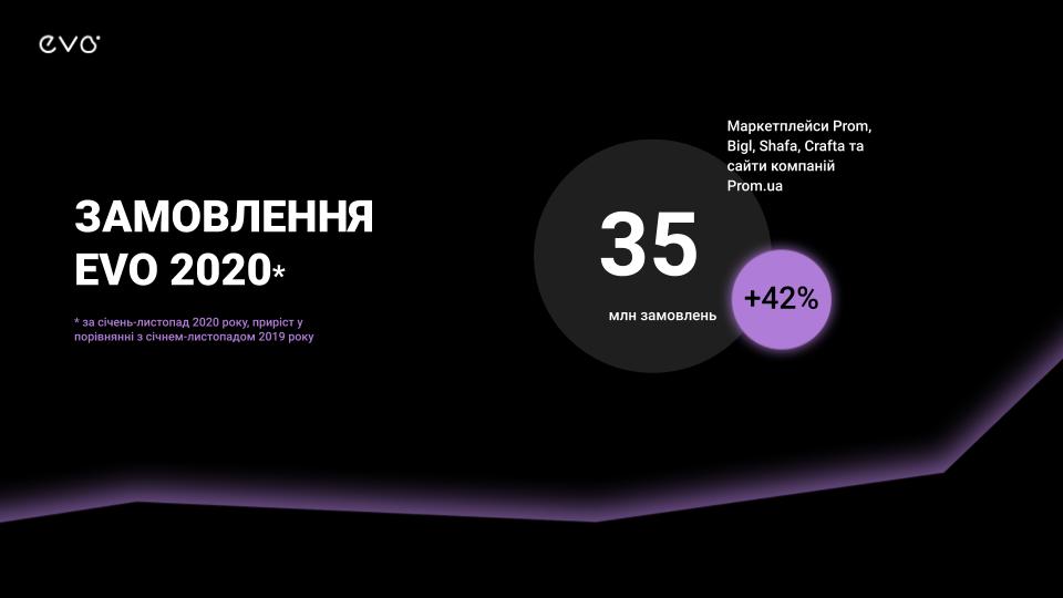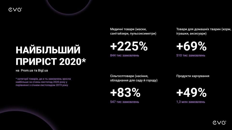 За год количество заказов на маркетплейсах EVO – Prom.ua, Bigl.ua, Crafta.ua, Shafa.ua, IZI.ua и сайтах компаний Prom.ua выросло на 42%. Средний чек упал на 10%. Компания связывает это с тем, что люди стали покупать онлайн значительно чаще и более дешевые товары – одежда, товары повседневного потребления, еду, маски.