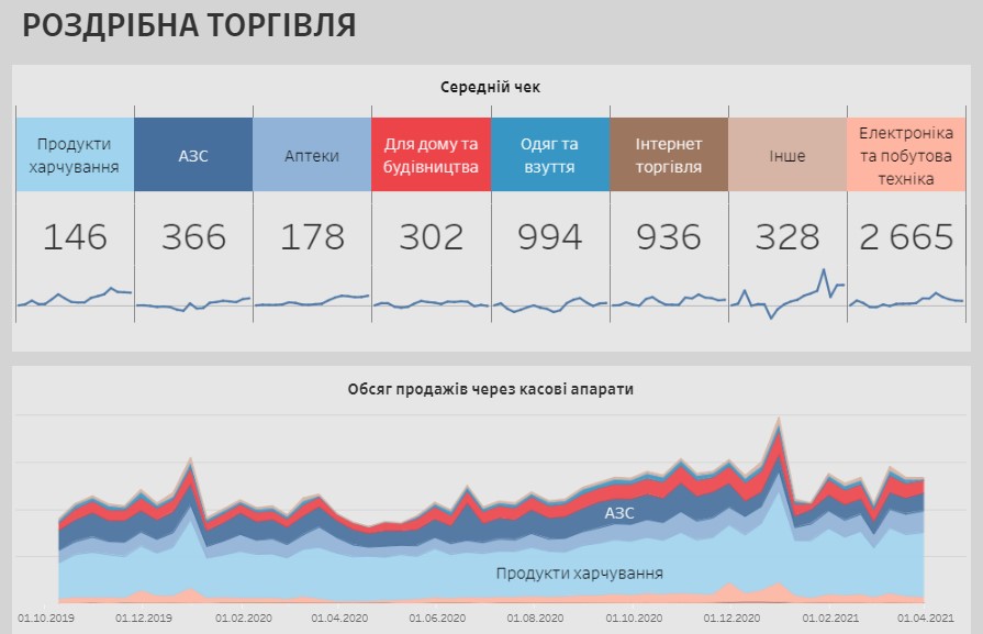 Интересно, что на 15% уменьшились также объемы электронной торговли. Дашборд фиксирует продажи на сумму 1,3 млрд грн.