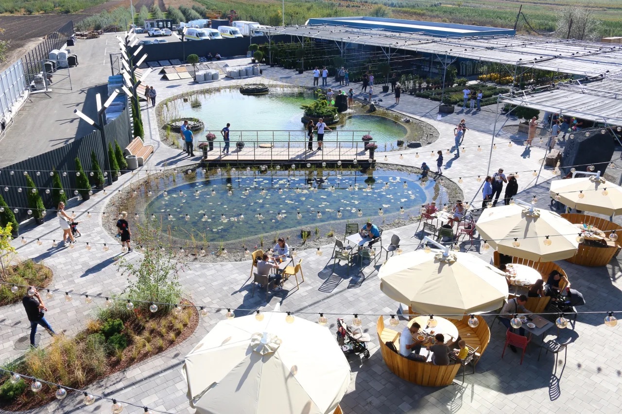 Открытая площадка с собственным озером и искусственным водопадом в теплое время года оборудована посадочными местами для посетителей ресторанов Food Market, зоной для прогулок и отдыха, а также LED-экраном. Это позволит компании использовать локацию и для проведения различных событий или трансляций.