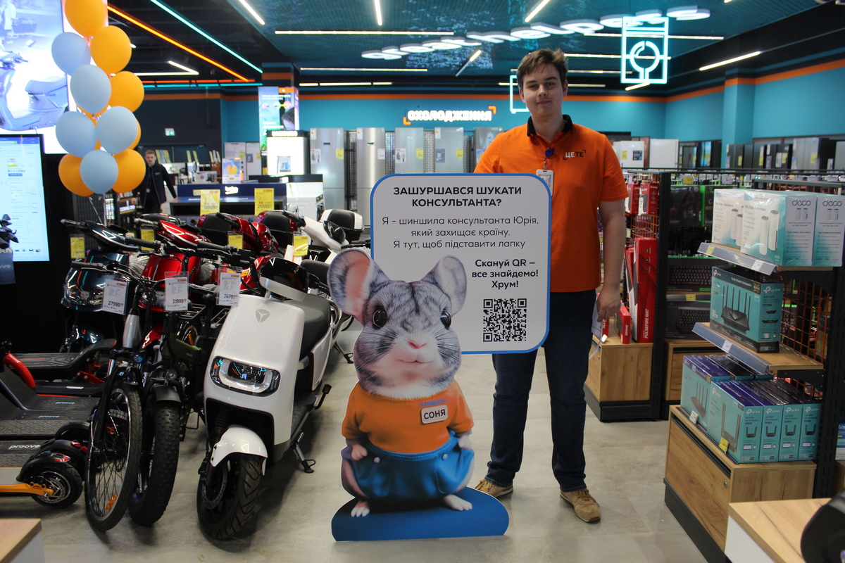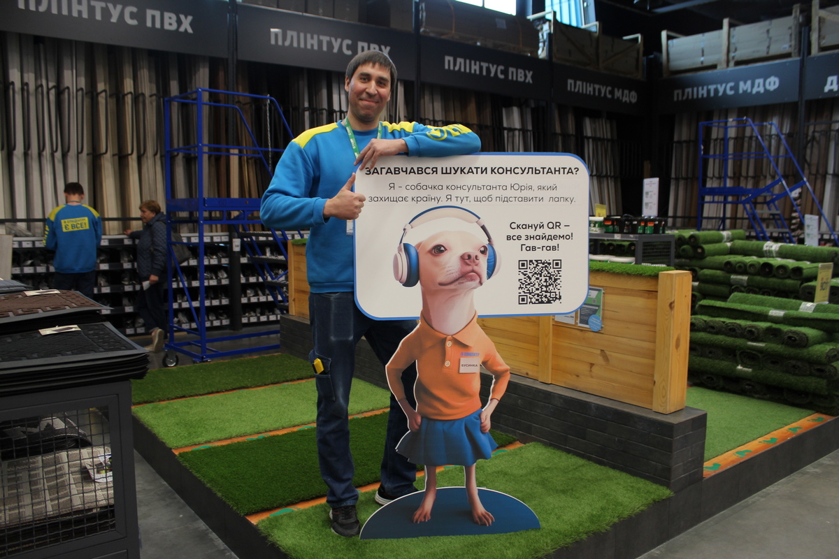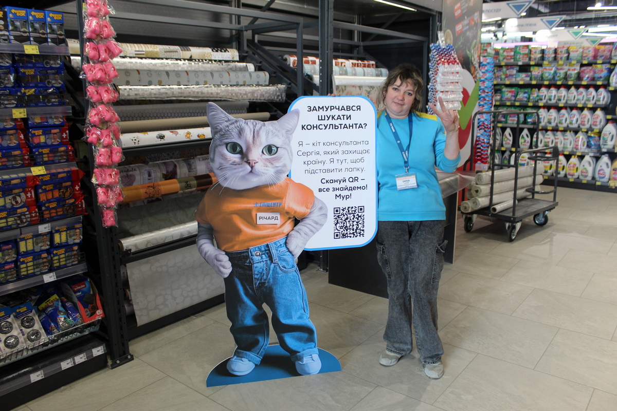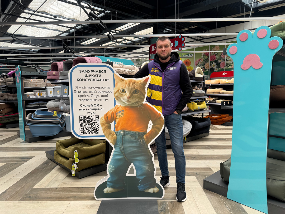 В торговом зале установлены ростовые фигуры «пушистых консультантов» – домашних животных мобилизованных работников: котов Ричарда и Монти, собак Сирка и Бусинки, а также шиншиллы Сони. На каждой фигуре – персональный QR-код. Сканируя код, клиент получает набор опций для решения своего вопроса:
