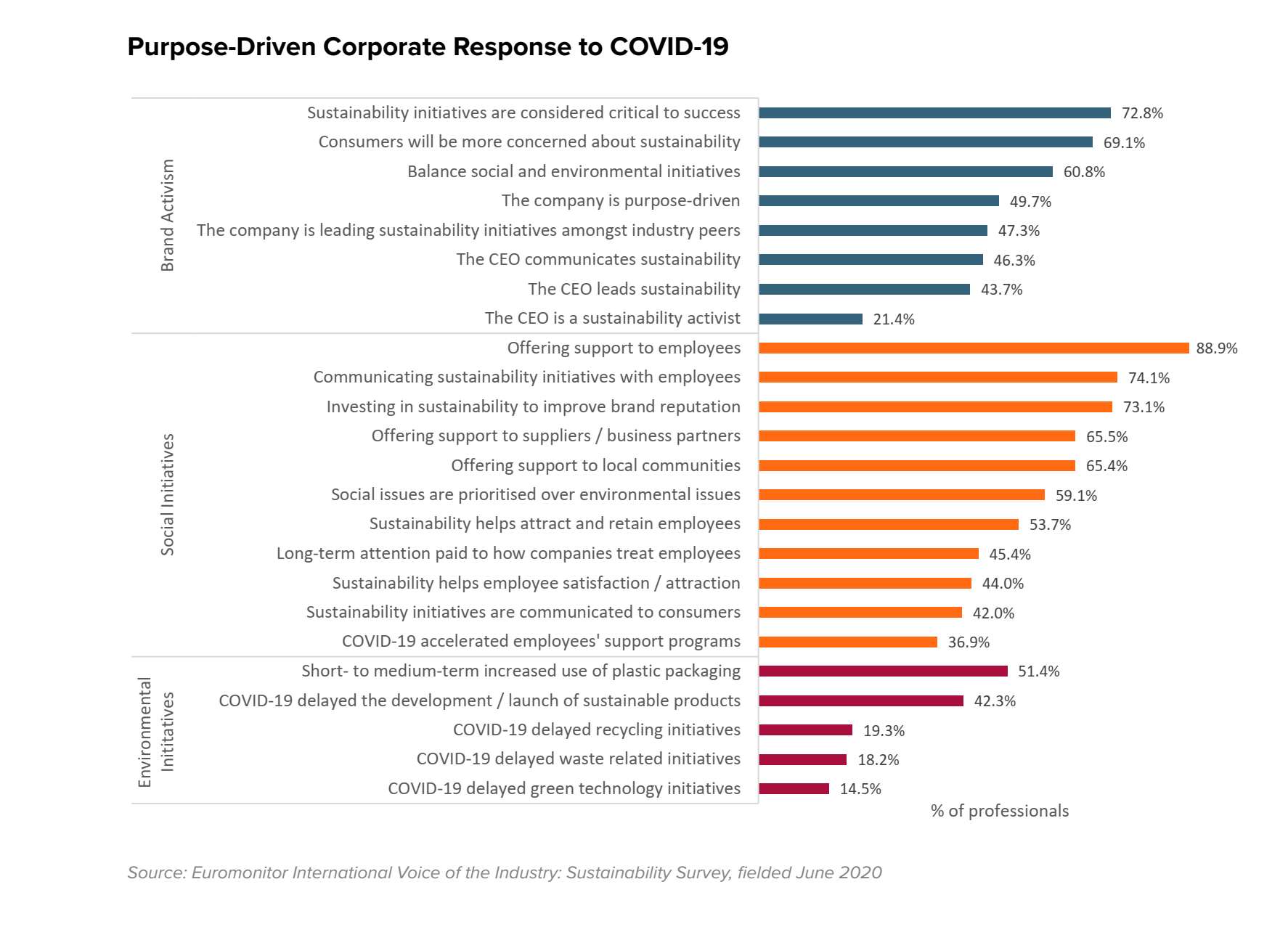 Когда потребители стали уделять больше внимания действиям компаний во время локдауна, активность бренда получила новое ощущение социальной цели. В августе 2020 года 14 руководителей высшего звена в том числе из компаний Danone, Philips, L’Oréal и Mastercard, создали благотворительную организацию под названием Leaders on Purpose. Это сообщество генеральных директоров, работающих над устойчивыми инновациями, чтобы согласовать корпоративные стратегии с экологическими проблемами.