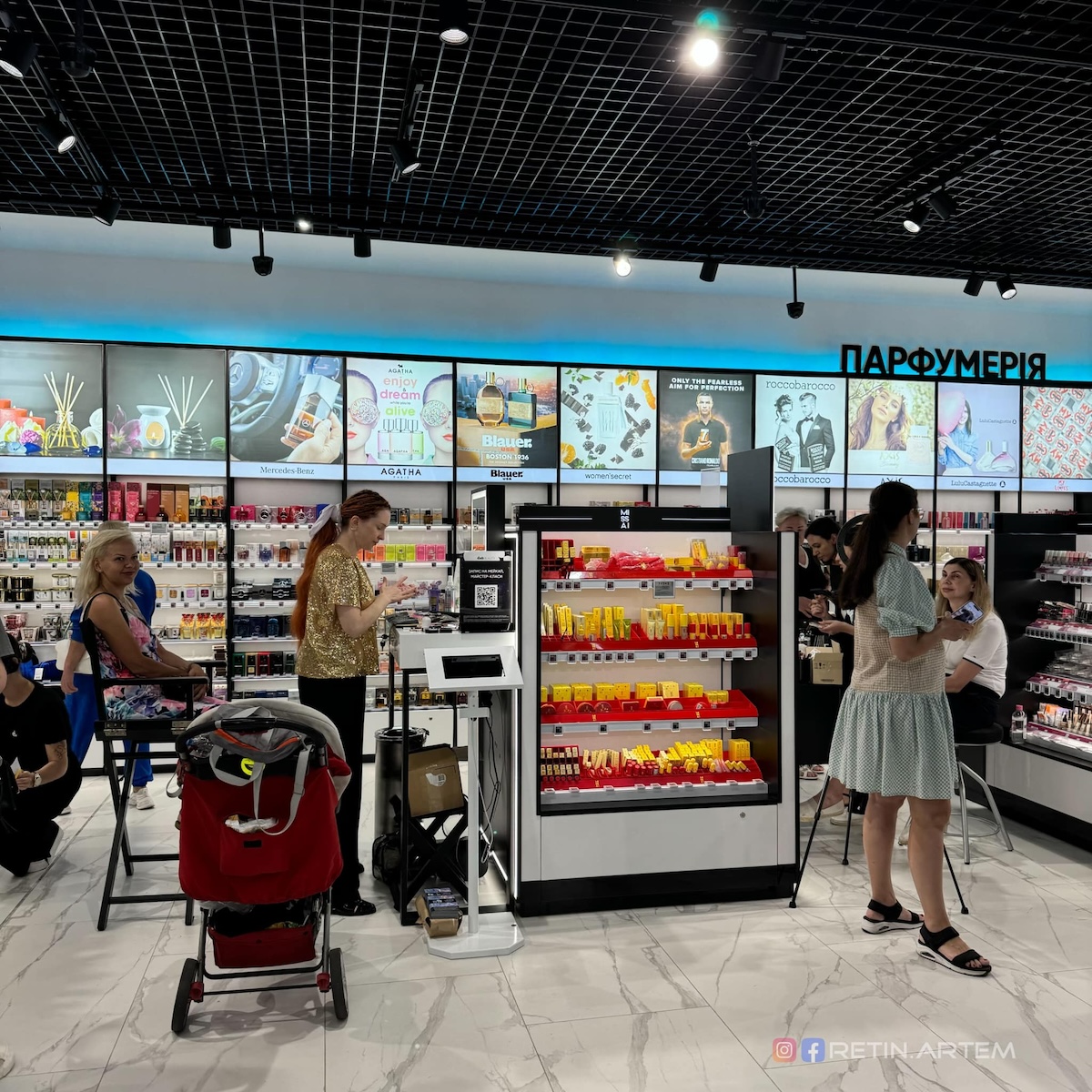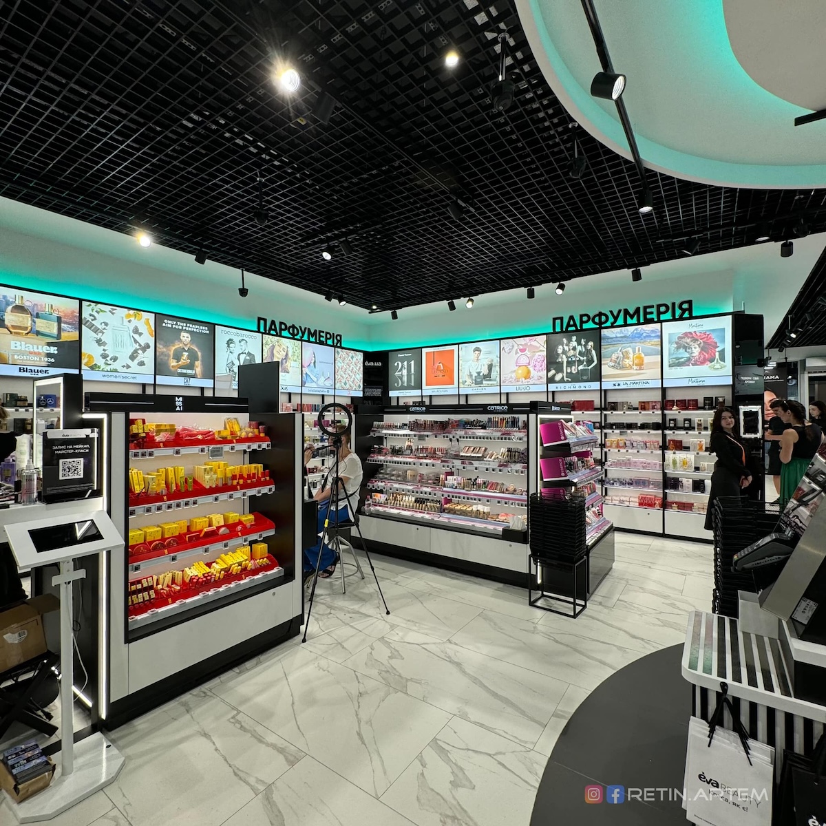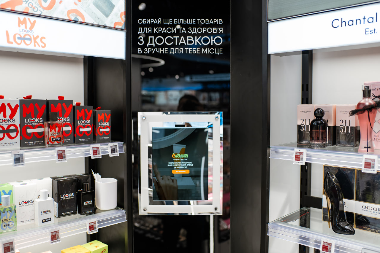 В магазине оборудованы зоны тестирования зубных щеток, станков для бритья и кистей для макияжа. Стенд с накладными ресницами позволяет ознакомиться с их различными типами и простыми видеоинструкциями по использованию. В целом ассортимент магазина включает более 7500 наименований товаров, а благодаря планшетам для заказа на eva.ua и точке выдачи интернет-заказов в магазине покупатели получают доступ к более 120 000 товаров.