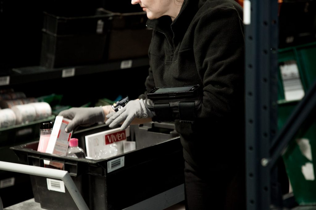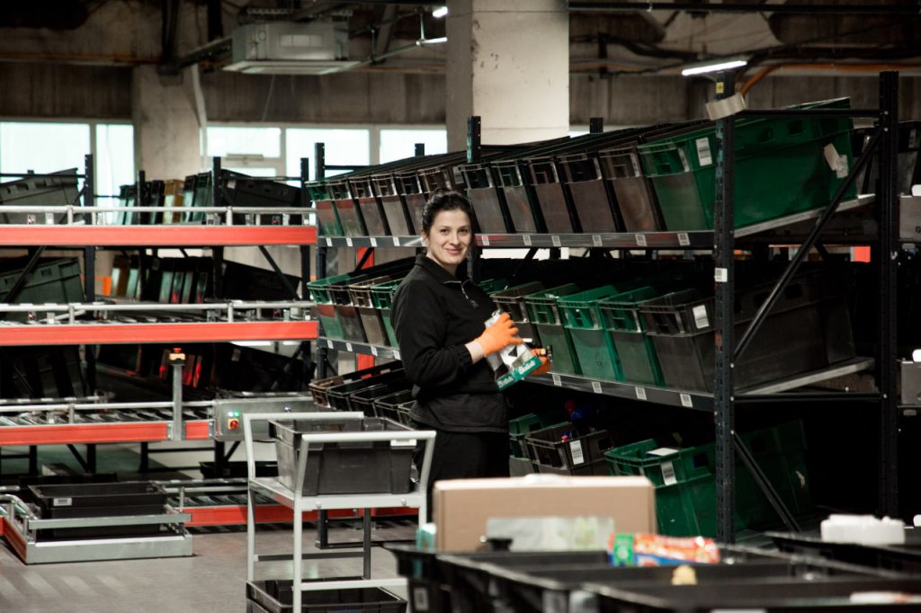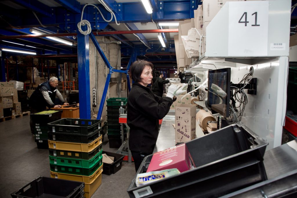 Информацию о заказах сотрудники получают на терминалы сбора данных и начинают его формировать. Все товары на складе разделены по категориям, могут храниться на разных уровнях. Зона отбора поделена на несколько частей, и каждый специалист отвечает за свою. Необходимые продукты собираются в ящики и отправляются в зону раскладки продуктов по заказам. Они поступают «волнами», где-то по 70 заказов в волне.