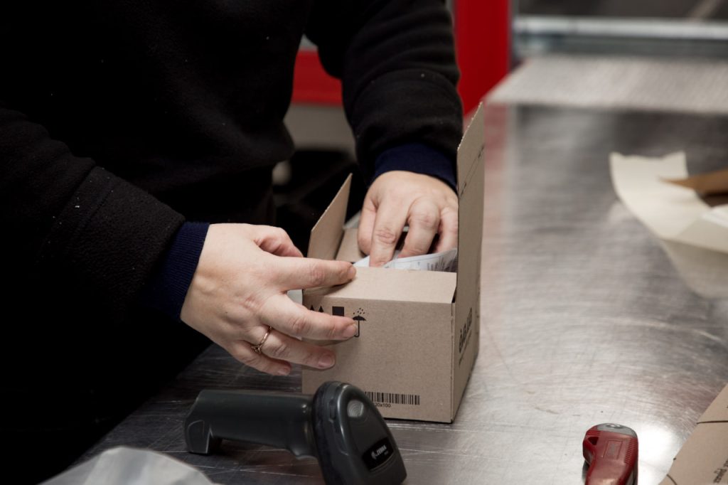 В зоне контроля сотрудники проверяют заказ и упаковывают его в коробки. Штрихкоды на коробки наносятся автоматически, после чего посылки сортируются на специальной линии и формируются в паллеты по типам доставки.