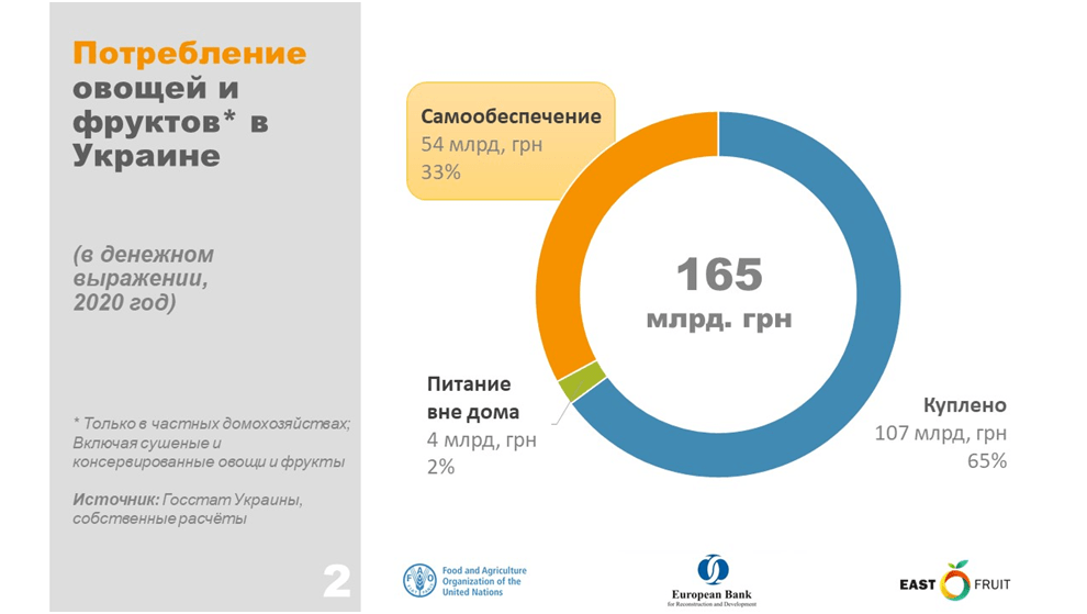 Во-первых, если говорить о более широком потреблении овощей и фруктов (включая сушеные и консервированные), то около трети объема потребления в Украине население выращивает самостоятельно. Такой вывод был сделан на основе анализа данных опроса домохозяйств, проводимого Госстатом Украины. В денежном выражении это около 54 млрд грн в год. Эта сумма фактически представляет собой потенциал роста розничной торговли овощами и фруктами Украины даже без повышения уровня доходов населения.