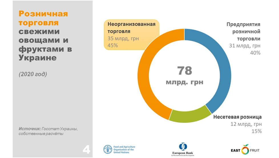 Согласно данным исследования Продовольственной и сельскохозяйственной организации ООН (ФАО), предприятия розничной торговли и предприниматели суммарно обеспечивают 55% всех продаж на украинском рынке свежей плодоовощной продукции. Оставшаяся часть приходится на неорганизованную торговлю.
