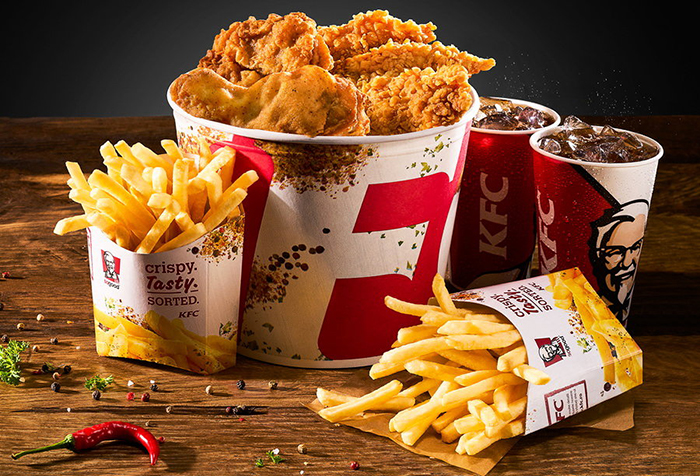 KFC сделали ставку на блюда из курицы. Фирменный рецепт легендарного основателя фаст-фуда – полковника Сандерса – куриные кусочки на кости, обжаренные с добавлением 11 специй. Сейчас в ресторанах подаются бургеры и роллы, салаты, в состав которых также входит курятина. Предлагаются мороженое и десерты. Кроме обычного набора безалкогольных напитков, в меню включено пиво, что не очень вписывается в концепцию семейного фаст-фуда. Поскольку куриные кусочки имеют разную величину, невозможно рассчитать точный вес блюда. Частая смена руководства вела за собой введение новых блюд. Но не все эксперименты были удачными.
