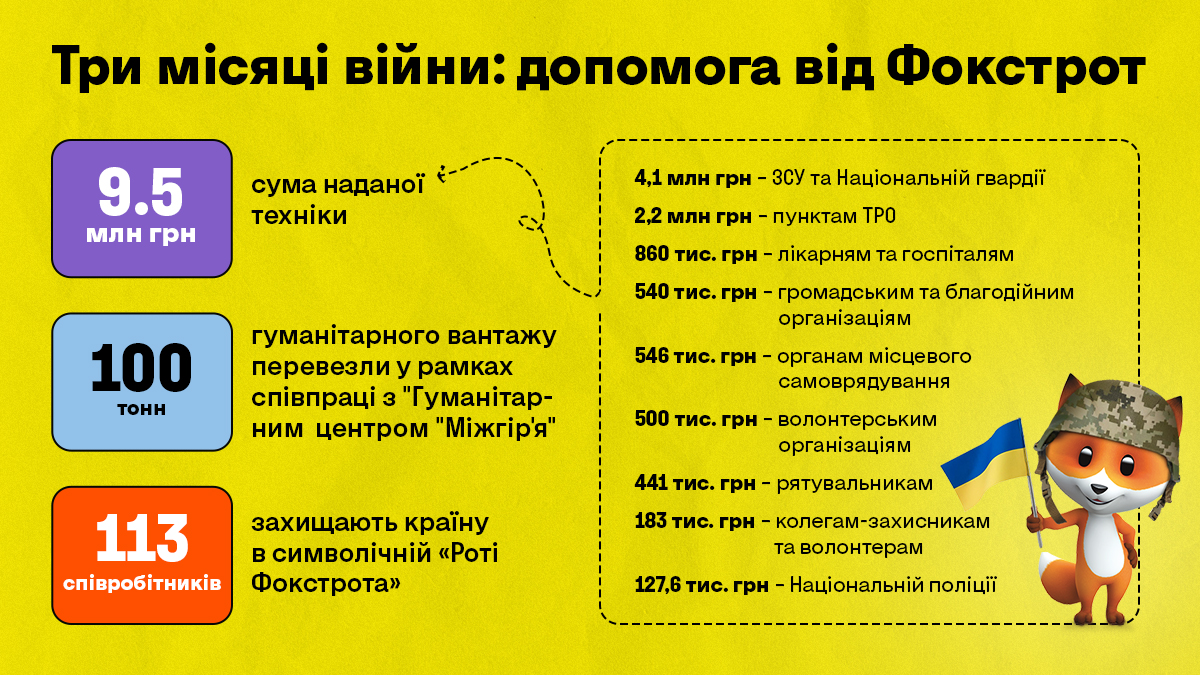 «С начала войны мы не могли предвидеть, что будет с компанией в ближайшей перспективе. Но точно знали, что делать здесь и сейчас: помогать нашим воинам современными гаджетами, техникой для быта, поддерживать друг друга и быть единым фронтом, – говорит Алексей Зозуля, исполнительный директор Фокстрот. – Поэтому результаты этих трех месяцев – это прежде всего не сумма, это наш гражданский вклад в число победных атак украинских защитников на передовой, спасенные жизни в чрезвычайных ситуациях и создание комфортных условий для переселенцев».