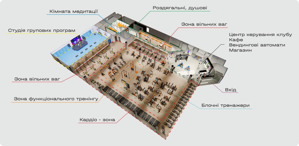 Каждое спорт пространство имеет зону для групповых тренировок, функциональную зону для малых групп, кардио-зону, зону растяжки, а также место для работы со свободным весом и спортивным оборудованием. На территории есть ЦУК (центр управления клубом), социальное пространство с кафе-баром, лавочка с брендовой линейкой спортивного экипа от Decathlon, аксессуаров и спортивного питания и, безусловно, раздевалки и душевые. Доступ ко всем сервисам и покупкам осуществляется простым сканированием браслета гостя.