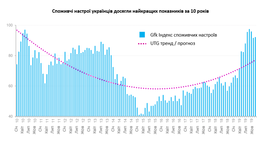 После резкого «проседания» покупательского оптимизма в прошлые годы, в Украине наблюдается устойчивое восстановление потребительских настроений населения. Об этом сообщили в компании UTG, ссылаясь на данные международной исследовательской компании GfK. Так, уровень потребительских настроений украинцев в сентябре 2019-го достиг отметки 97,47. И, несмотря на незначительное снижение в декабре до 92,2 пунктов, индекс потребительских настроений заметно опередил показатели 2012-2018 годов.