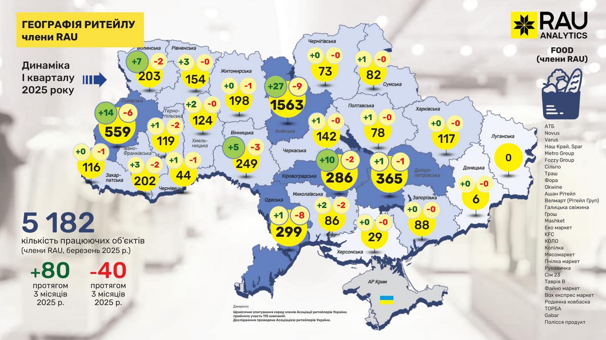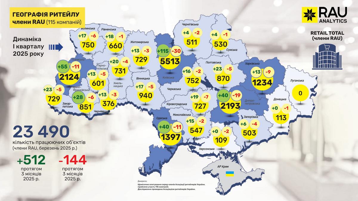 Retail Association of Ukraine представляет очередное эксклюзивное аналитическое исследование под названием “География ритейла”. На основе данных сетей, являющихся членами RAU, была собрана и обобщена информация о том, как изменилась география ритейла в I квартале 2025 года и какова динамика развития отрасли по регионам.