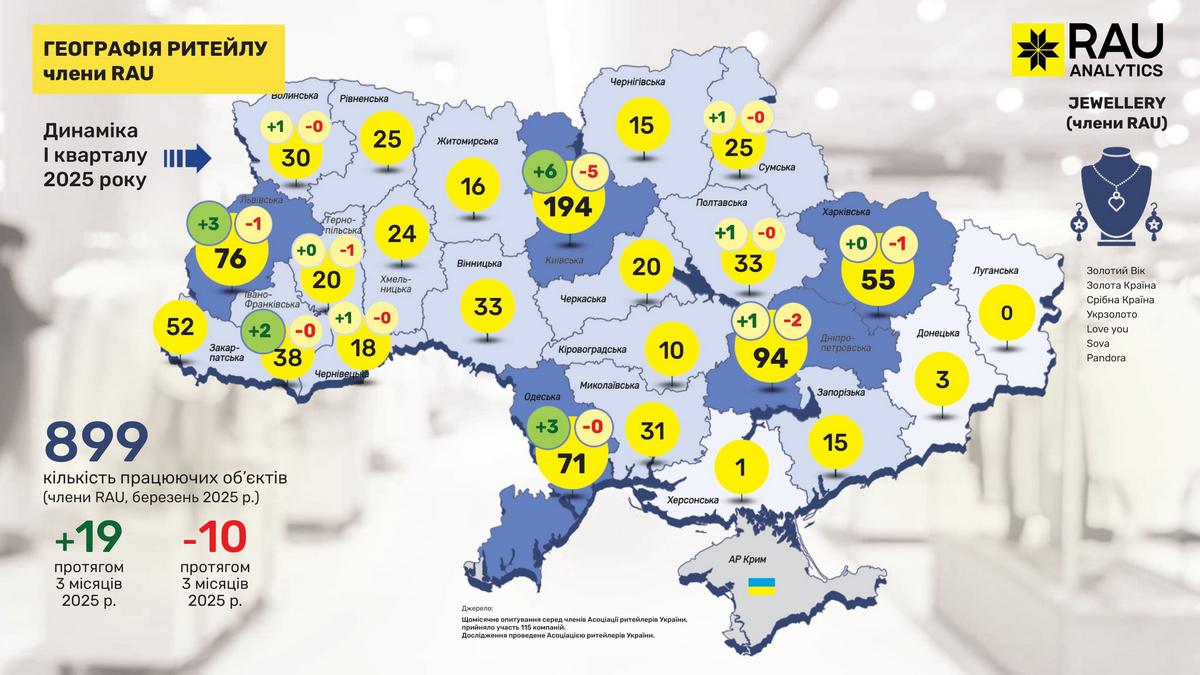 Торговля ювелирными изделиями, которая больше всего пострадала от российского вторжения, довольно неплохо возобновилась. Так, по состоянию на март 2025-го работало уже 899 точки. За три месяца добавилось 19 магазинов, хотя с учетом 10 закрытых торговых точек выходит всего на 9 больше. Пятая часть торговых точек приходится на столичный регион – 194. Пятерка областей с наибольшей концентрацией ритейла та же (Киев, Днепр, Львов, Одесса, Харьков). Но самый большой прирост фиксируется в Одессе, Львове и Ивано-Франковске. Здесь среди наиболее активных игроков можно выделить три сети – Love you, SOVA и Pandora. Первые две открыли по пять магазинов, а Pandora – четыре.
