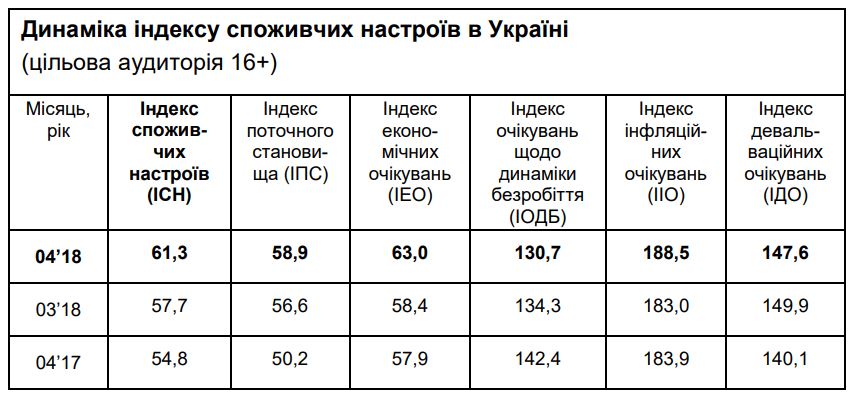 В апреле 2018 потребительские настроения украинцев улучшились: индекс потребительских настроений (ИПН) составил 61,3, что на 3,7 п больше, чем в марте 2018 года. Наибольшие изменения претерпел