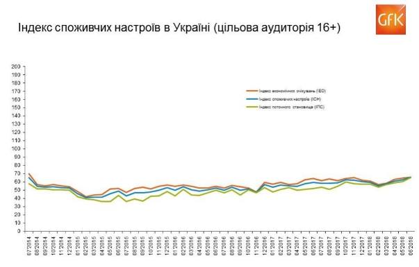 В июне 2018 индекс потребительских настроений составил 65,6, что на 2,7 п больше, чем в мае. Больше всего поменялись индексы текущего личного положения и индекс ожидаемой динамики безработицы. Об этом свидетельствуют данные исследования потребительских настроений в Украине, которое ежемесячно осуществляет GfK Ukraine.