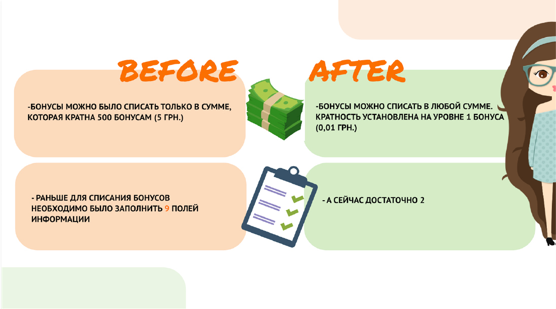 Изменили и систему списания бонусов. Прежде всего, сделали возможным списать любую сумму бонусов и сократили количество полей для заполнения с девяти до двух. Значимым шагом стало внедрение виртуальной карты участника программы лояльности – этот шаг позволили увеличить количество участников на пять процентов.