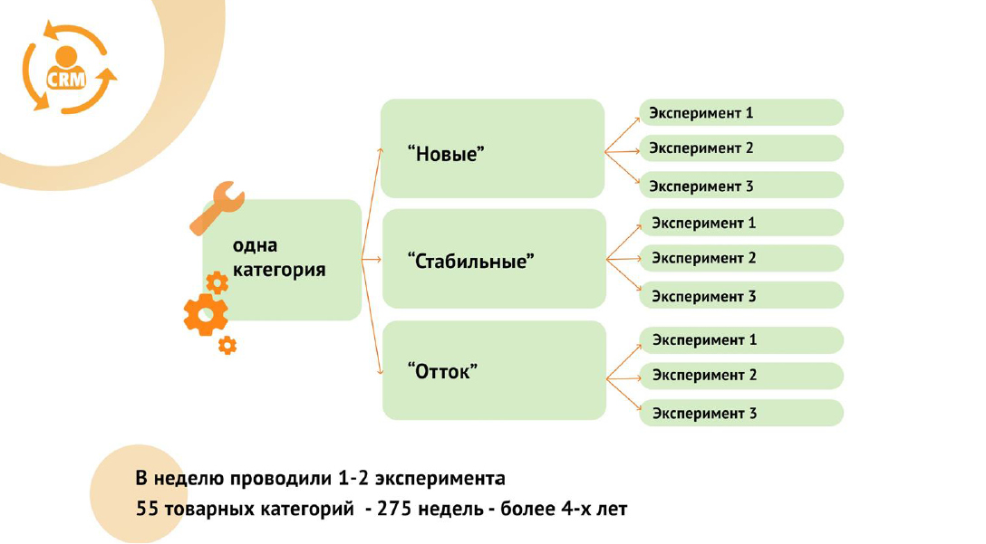 Учитывая, что за неделю успевали провести 1-2 эксперимента, а в каждой категории товара есть стабильное ядро потребителей, новые и отсеявшиеся клиенты, то на тестирование всей категории надо примерно два месяца. А для всех 55 категорий товаров – более четырех лет, чтобы сформировать качественный клиентский актив. Но штука в том, что уже через год поменяются и сами люди, и модели экспериментов. То есть существующая структура не может выполнить данную задачу качественно.