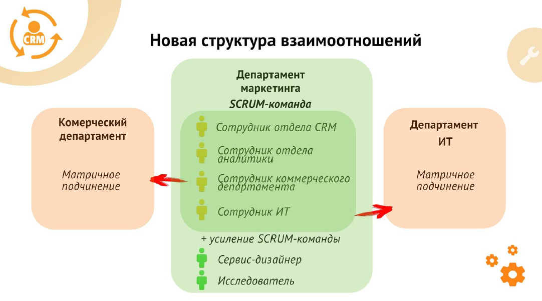 Поэтому решено было объединить специалистов из разных подразделений в одну SCRUM-команду. Где работники с разными компетенциями были матрично подчинены функциям. При этом штат не вырос.