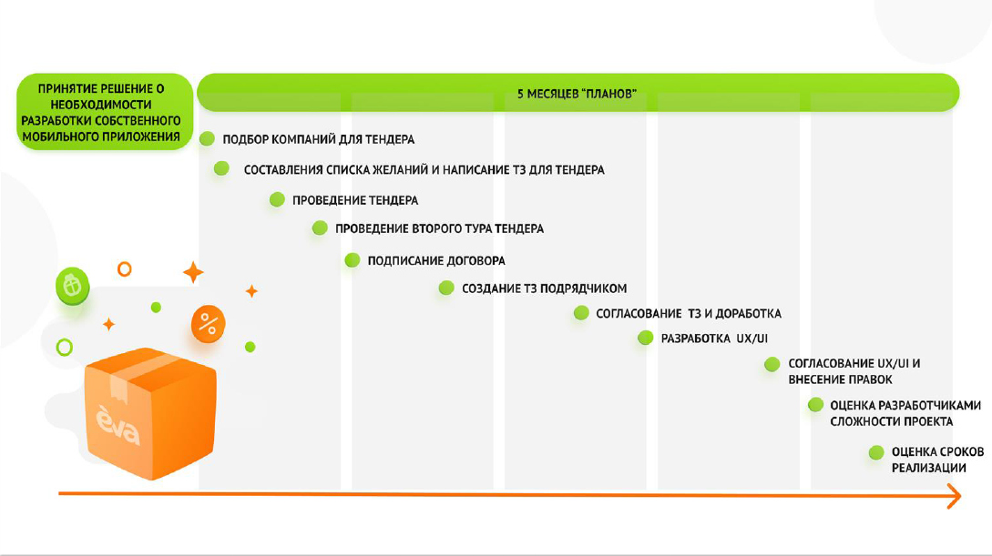 Главная идея нового приложения заключалась в возможности настраивать омниканальный опыт клиента. В первую очередь, пользователя программы лояльности, а также покупателя в интернет-магазине EVA. Для сети было принципиально важно выпустить приложение ровно через год, не затягивая процесс разработки. Но классический путь, применяемый многими компаниями в данном случае, дал сбой. На написание техзадания, проведение тендера для выбора исполнителя и прочие предварительные этапы ушло значительно больше времени, чем планировалось. Первый релиз приложения был обещан через год, но только на подготовительные этапы ушло пять месяцев. То есть дедлайны сдвигались как минимум на полгода вперед. Возникли сомнения и в качестве исполнения работы подрядчика.