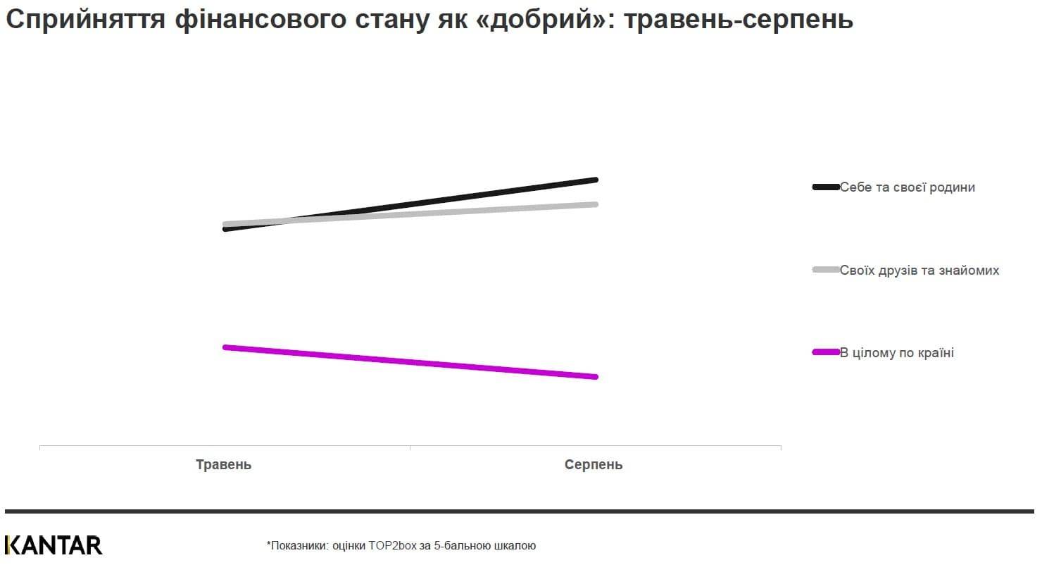 С мая Kantar также фиксирует, как меняется ощущение финансового состояния украинцами. Оценка проходила по 5-балльной шкале состояния от «хороший» до «плохой» и по трем направлениям: себя и своей семье, своих друзей и знакомых и страны в целом. Еще в мае у всех было занижено понимание своего финансового положения на уровне «еще протяну и как-то оно будет», а «в стране все плохо». В августе ощущение того, что по стране все плохо становится все сильнее, хотя восприятие своего финансового положения и друзей оценивается как «хорошо».