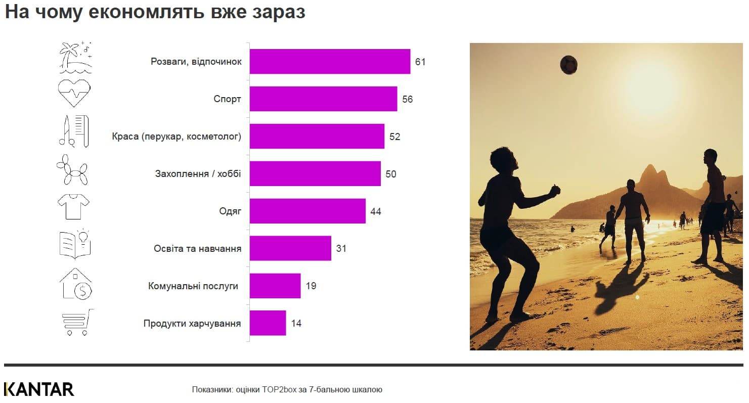 Больше всего в Украине экономят на развлечениях, отдыхе и спорте. Далее следует – красота (парикмахер, косметолог), о чем говорит более 50% респондентов. Также украинцы экономят на хобби и одежде. На образовании – только треть опрошенных. В меньшинстве экономия на продуктах питания и коммунальных услугах.
