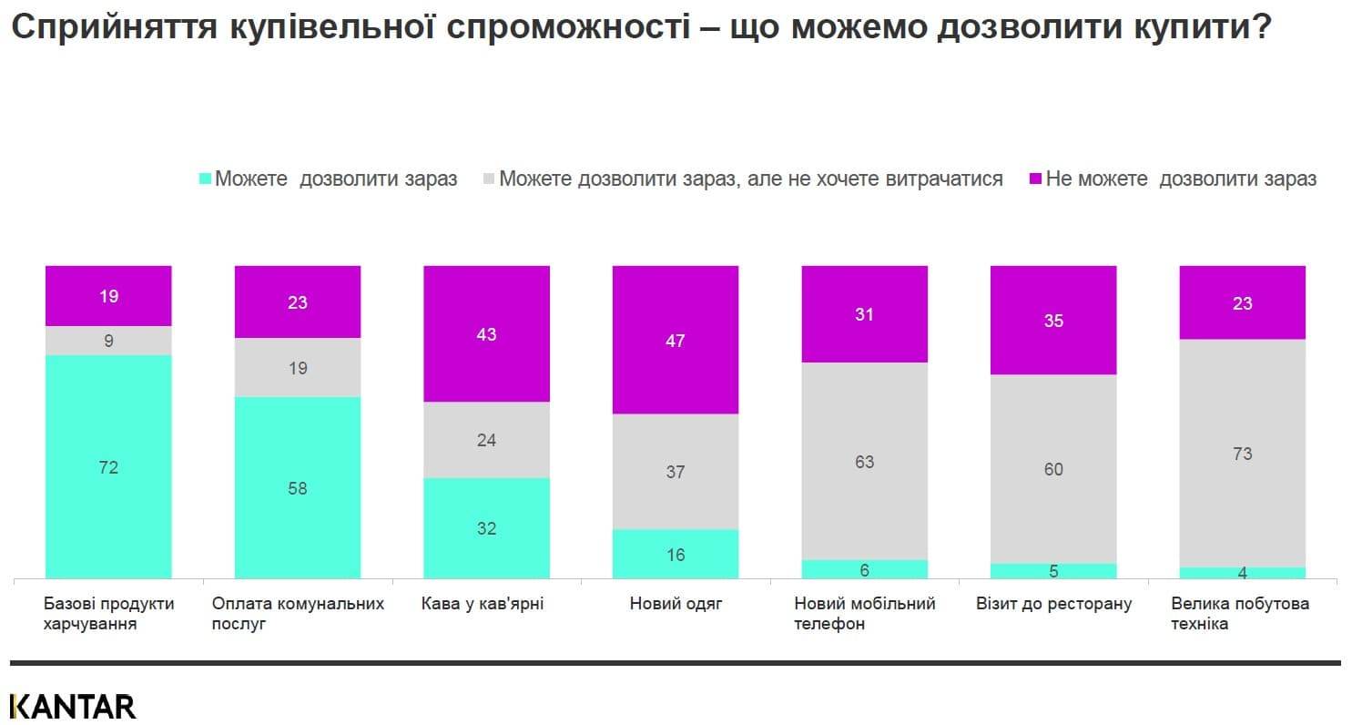 Большинство опасений украинцев связано с экономическими параметрами. 48% украинцев ожидают уровня инфляции 20% и выше, однако боятся не этого. Наибольший фактор для опасений украинцев – рост цен на продукты питания. На это указывает 66% украинцев и это вдвое больше страха потерять работы (33%) и опасений инфляции (32%). Страх нехватки ассортимента каких-либо брендов не превышает 5%. К экономии и потребительским ограничениям уже прибегают 53% украинцев. Только одна треть опрошенных потребителей может купить кофе в кафе, одна шестая – позволить себе купить новую одежду. Однако они указывают на это не в смысле, что нет денег, а в смысле есть деньги, и при этом “я готов их потратить на кофе или одежду”.
