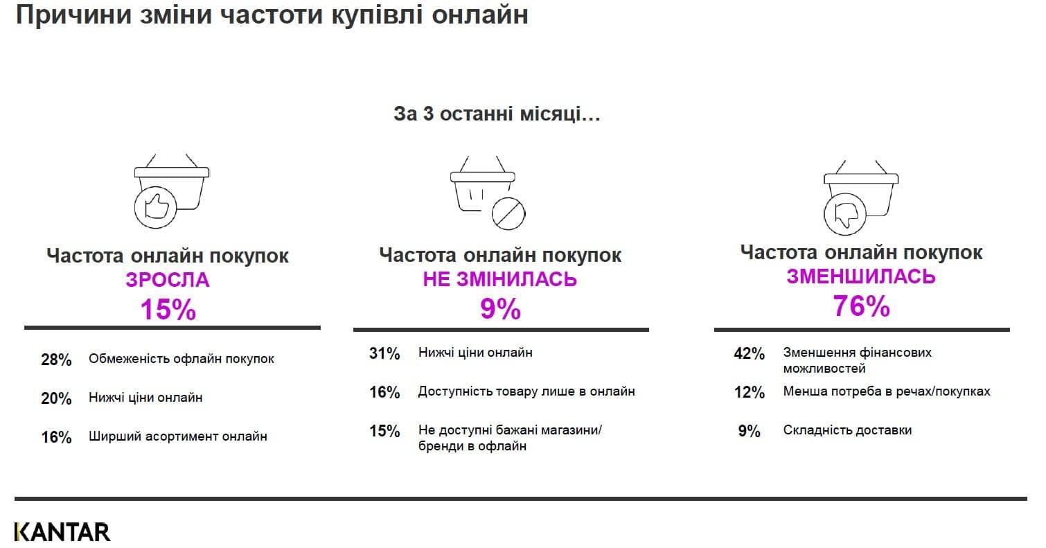 При этом частота покупок онлайн под влиянием войны снизилась на 76%. Среди причин – уменьшение финансовых возможностей, меньшая потребность в вещах и сложность доставки. Только у 15% украинцев, из-за ограниченности офлайн-покупок, более низких цен онлайн и более широкого ассортимента, эта частота не изменилась.