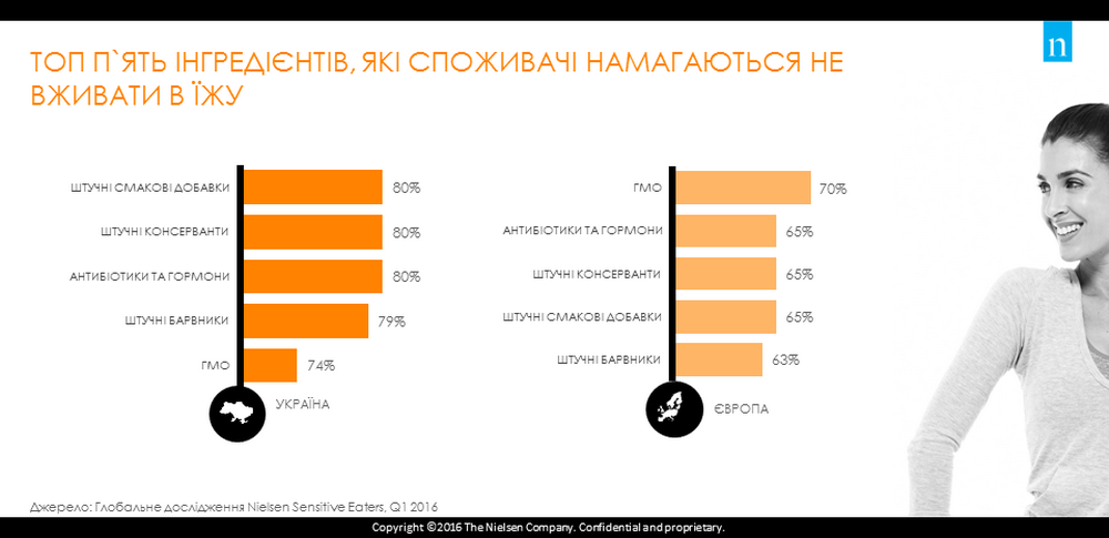 Несмотря на непростую экономическую ситуацию, украинский потребитель предпочитает натуральные продукты питания. Компания Nielsen провела ряд исследований, выясняя важность натуральных ингредиентов для жителей Украины. Согласно опросам, 75% украинских покупателей проверяют состав на упаковках, а 73% готовы платить больше за натуральный продукт. В соответствии с рапортом Global Health and Ingredient-Sentiment 2016 года, каждый третий украинец следит за весом, сознательно выбирая продукты с меньшим содержанием сахара. Наиболее нежелательными в составе продуктов питания украинские потребители, как и европейские, назвали искусственные добавки и красители (80% и 79%), антибиотики и гормоны (80%), а также ГМО (74%).