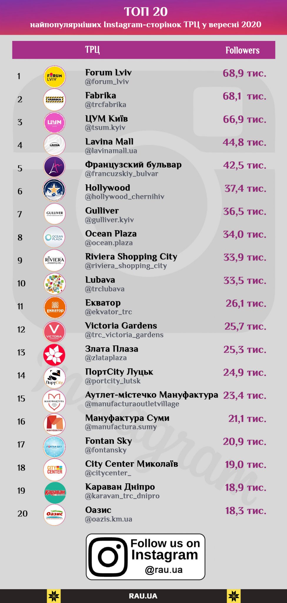 Топ-20 торгово-развлекательных центров в Instagram второй раз подряд начинается с эпических противостояний в первой тройке. Лишь несколько летних месяцев ЦУМ Киев занимал первую строчку рейтинга. Но теперь его отодвинули аж на третью. Forum Lviv и Fabrika заняли первое и второе место соответственно. И, похоже на то, спор между ними за первенство будет продолжаться. Отрыв меньше, чем в 1000 поклонников.