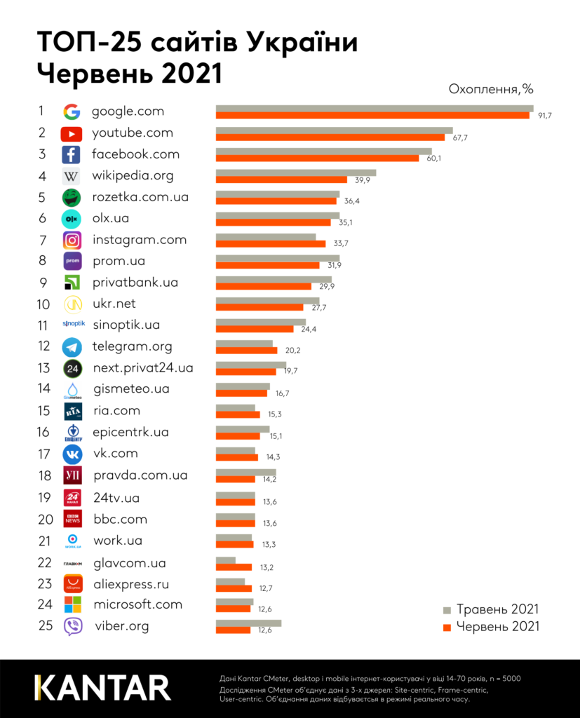 В рейтинг популярных сайтов впервые за долгое время вернулся Aliexpress.ru. Также в топе после перерыва появились новостные ресурсы: 24tv.ua (19-е место), bbc.com (20-е место), Glavcom.ua (22-е место). Стабильный лидер среди новостных ресурсов — Pravda.com.ua. Тройка неизменных лидеров: Google, Youtube, Facebook.