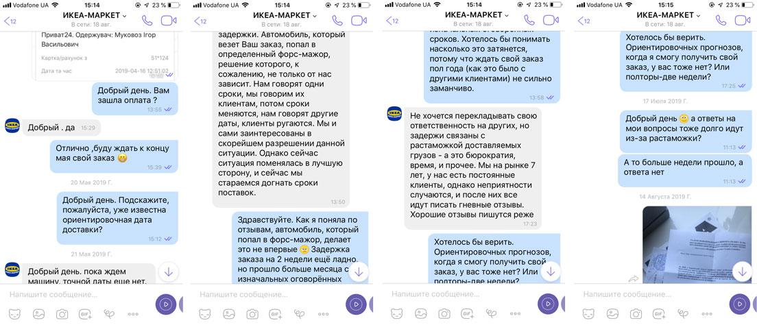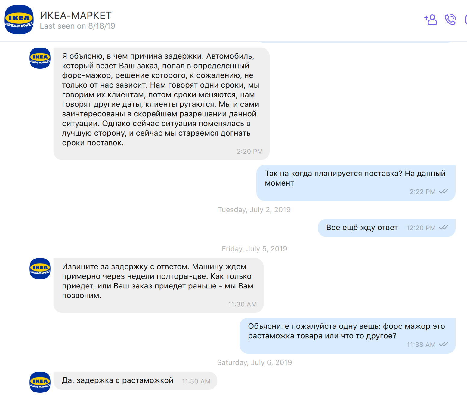 Не получив обещанную мебель в июне, Сергей Думик обратился в службу поддержки магазина. Оператор каждый раз извинялся и сдвигал сроки, оправдывая задержку «форс-мажором, в который попала машина». Позже в чате представитель магазина подтвердил, что проблема возникла с растаможкой товара.