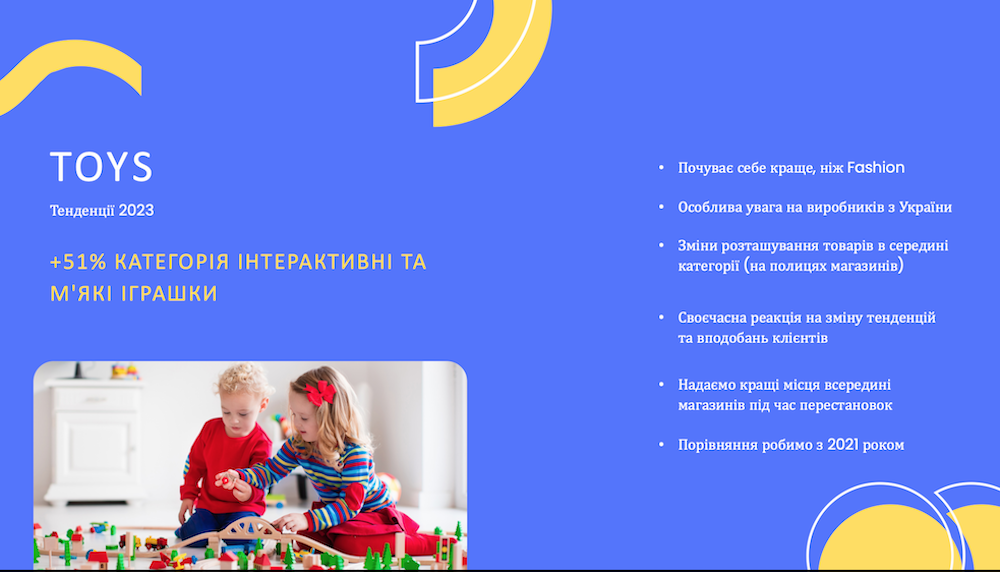 В декабре прошлого года мы открыли новый магазин на левом берегу Киева, который получил название Левобережный. После открытия этого магазина мы полгода наблюдали за тем, что покупают наши клиенты и какие у них ожидания. В мае этого года мы так же изменили расположение товарных категорий в этом магазине, немного уменьшив территорию для fashion-товаров и, наоборот, увеличив место для игрушек. И сейчас видим положительные результаты от такой перестановки в товарообороте и продажах.