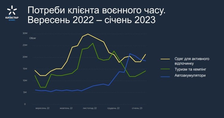 В частности, в период с сентября 2022 по январь 2023 можно наблюдать скачок спроса на одежду для активного отдыха, товары для туризма и кемпинга, а ближе к зиме стали актуальными автоаккумуляторы.