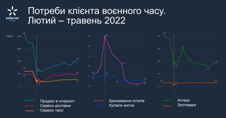 В феврале-мае 2022 года драматически снизился спрос на сервисы доставки, такси, онлайн-покупки. В то же время, кардинально возросла потребность в гостиницах, ведь в этот период миллионы украинцев эвакуировались в центральные и западные области. С течением времени возобновился спрос на аптеки и увеличились продажи в интернете.