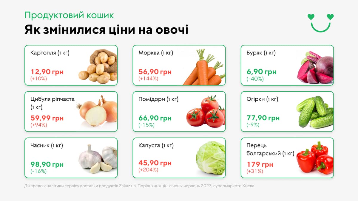 Больше всего упала цена на свеклу. Один из основных составляющих ингредиентов традиционного украинского блюда сейчас на 40% дешевле, чем в январе и стоит в среднем 6,90 грн/кг. Что, к сожалению, не скажешь о других составляющих овощах борщового набора, обладающих противоположной динамикой. Так, с начала года рекордно подскочили цены на белокочанную капусту, средняя стоимость в июне – 45 грн/кг. В то время как в январе ценники на овощ в супермаркетах были от 10 до 14 грн за килограмм, что втрое дешевле, чем сейчас. Также вдвоє взлетели цены на морковь и лук. В настоящее время цена репчатой в супермаркетах колеблется от 49 до 69 грн за килограмм. Морковь в среднем стоит 56,90 грн/кг, что на 144% дороже, чем в январе.
