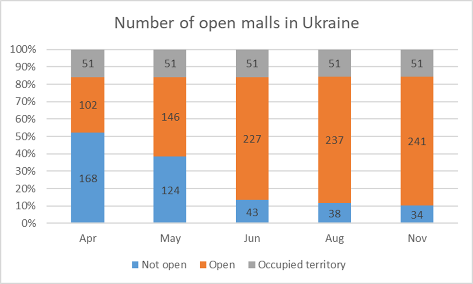 По состоянию на 1 ноября в Украине возобновили работу 88% торговых центров – исследование УРТЦ