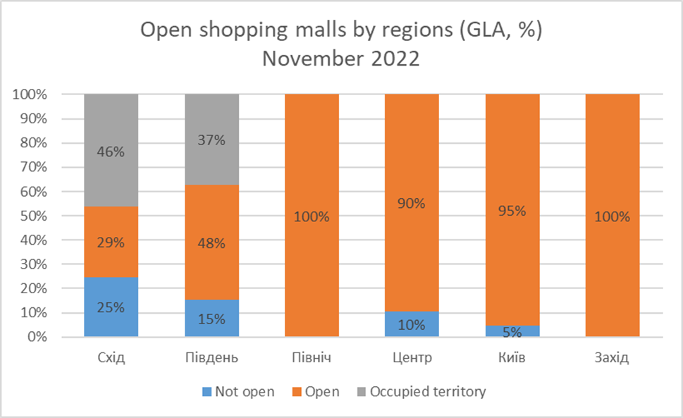 Наибольшая доля работающих ТЦ остается на востоке Украины. Несмотря на возобновление работы ТРЦ Nikolsky, в восточном регионе работают только 29% торговых площадей, 25% не работают и 46% находятся на оккупированной территории. Меньше половины торговых площадей работает также на юге Украины (48%). Здесь также большая часть ТЦ пока остается на оккупированной территории (37%). В столице все еще закрыто только 5% торговых площадей в ТЦ, преимущественно через ТРЦ Ocean Plaza. Также незначительная часть площадей не работает в Центральных регионах (10%). В свою очередь на Севере и Западе работают все торговые центры. Это связано, в первую очередь, с отсутствием разрушений.