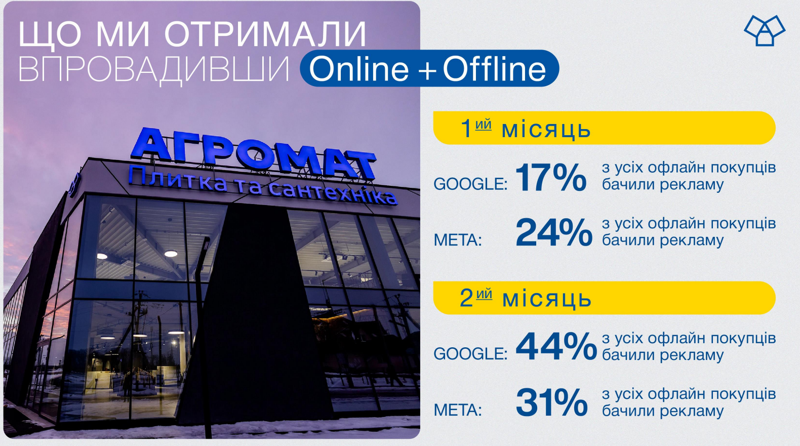 Мы проводим множество собственных исследований. В частности, опрашиваем новых клиентов в розничных магазинах. Задаем простой вопрос – откуда узнали об Агромат. И 46% приходят к нам по рекомендации, 38% с диджитал рекламы и 16% – наружная реклама, радио, вывески.
