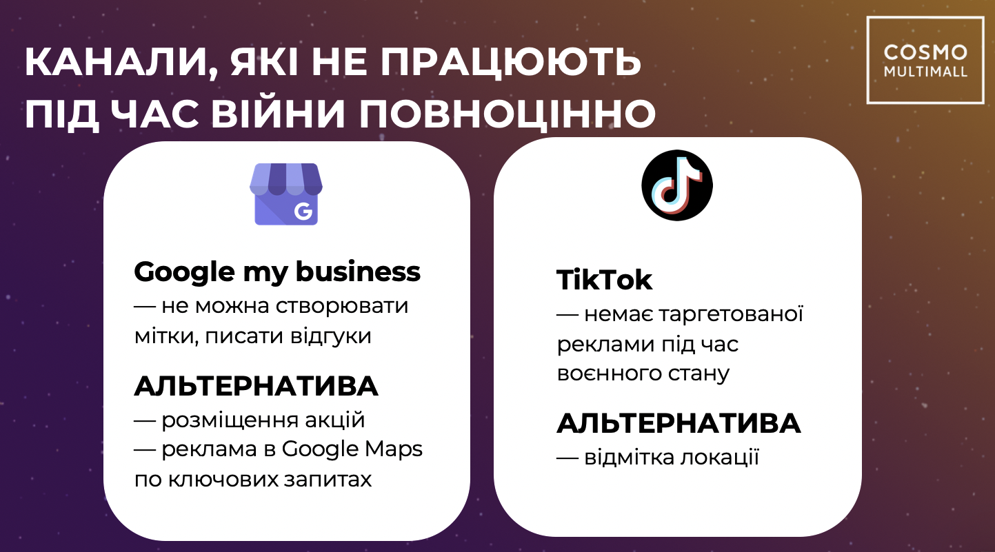 В частности, в Google my business мы не можем разместить метку локации. Например, мы открыли новый супермаркет в другом объекте и столкнулись с тем, что без метки локации сложнее, чем до войны раскручивать новый объект. Но есть альтернатива – у Google maps есть реклама по ключевым запросам, которая тоже хорошо работает. Ее также можно запустить, чтобы повысить охват.