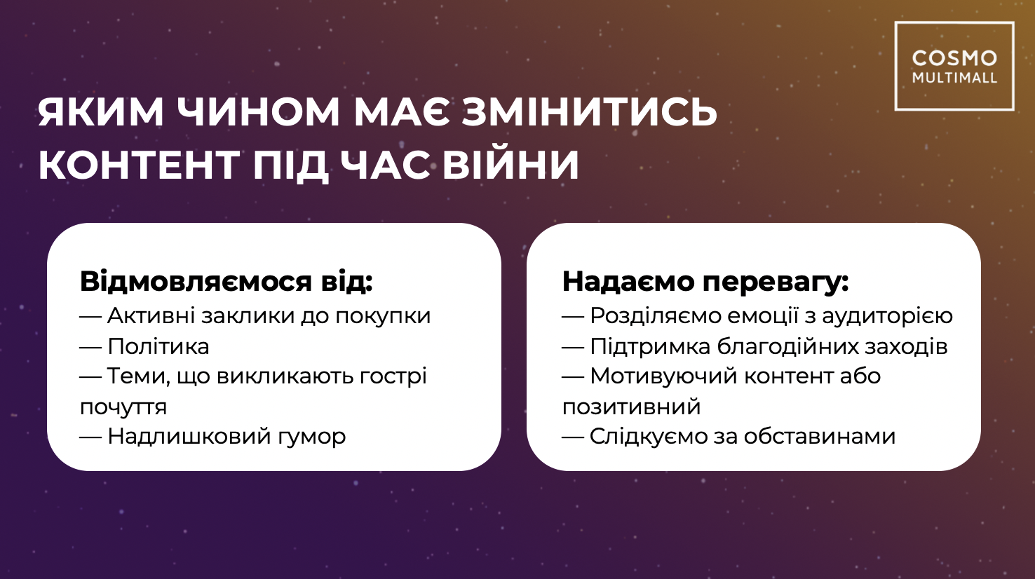 В коммуникации с аудиторией лучше избегать политических тем и быть очень осторожными с темами, которые вызывают острые чувства. Также сейчас не ко времени избыточный юмор. Позитивный контент должен быть, чтобы поднимать настроение, но важно чувствовать грань, за которую не стоит переходить.
