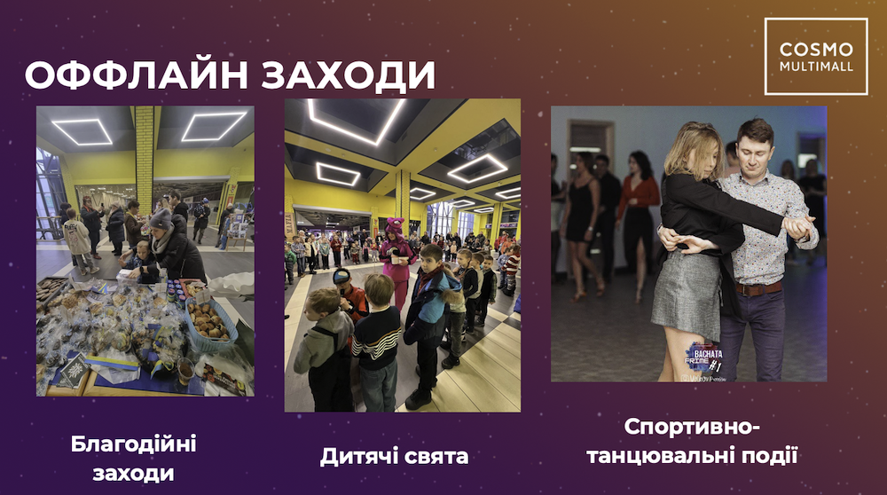Во время RAU workshop «Рынок торговой недвижимости во время войны» директор по маркетингу ТРЦ Cosmo Multimall Юлия Федоренко представила тему “Коммуникация с посетителями. Маркетинговые активности и их результаты”, в которой рассказала о самых эффективных каналах коммуникации в современных реалиях и о мерах привлечения посетителей в ТРЦ, в частности, коллаборацию с арендаторами, совместимые активности и сочетание шопинга с досугом, как инструмент работы с посетителями.