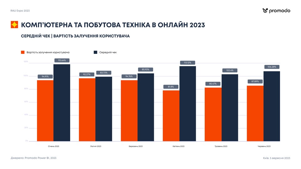 Компания Promodo с 2022 года начала сбор данных, высчитывая средневзвешенные показатели лидеров и крупных игроков электронной коммерции в определенных категориях товаров. Недавно были высчитаны такие показатели за январь-июнь 2023 года и сопоставлены с данными довоенного 2021-го, взятыми за 100%. Чтобы нивелировать влияние инфляции, все показатели выражены в долларах.