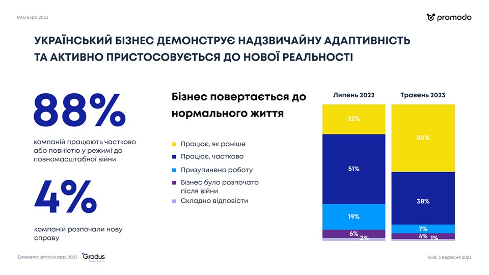 Как показал опрос компании Gradus, проведенный в этом году, 88% бизнесов уже возобновили полностью или частично работу до довоенного уровня. Это невероятный показатель, демонстрирующий чрезвычайную стойкость украинских компаний, в том числе и ритейла. Более того, уже 4% опрошенных предприятий начали новое дело уже во время войны.