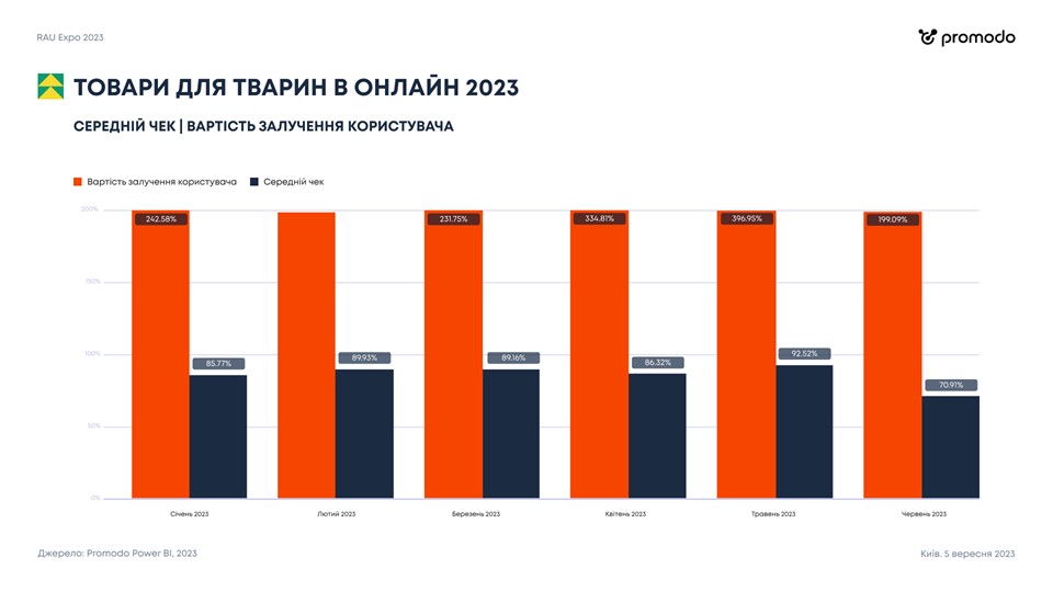 Если же взглянуть на размер среднего чека, не дотягивающего до показателей 2021 года (в среднем 80%), можно заключить, что потребители перешли на более экономичный сегмент покупок для своих домашних любимцев. А привлечение новых покупателей стоит очень дорого – на 200-300% больше чем до войны.