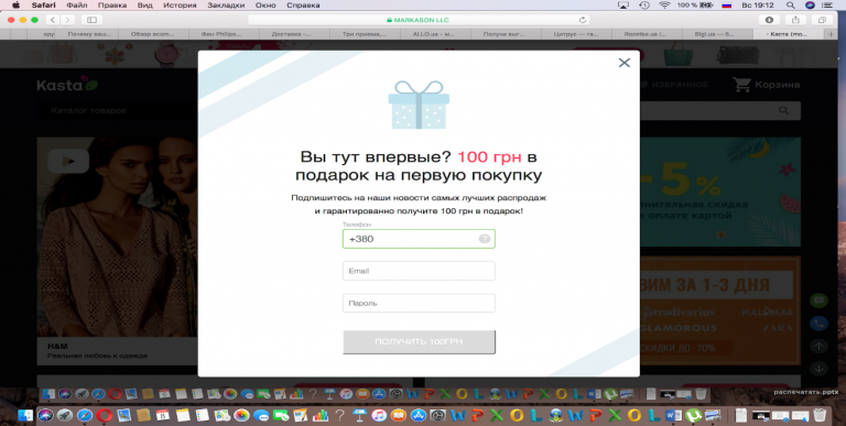 Отличный тому пример – интернет-магазин одежды Kasta. При посещении сайта всплывает предложение о регистрации и скидке на первую покупку: